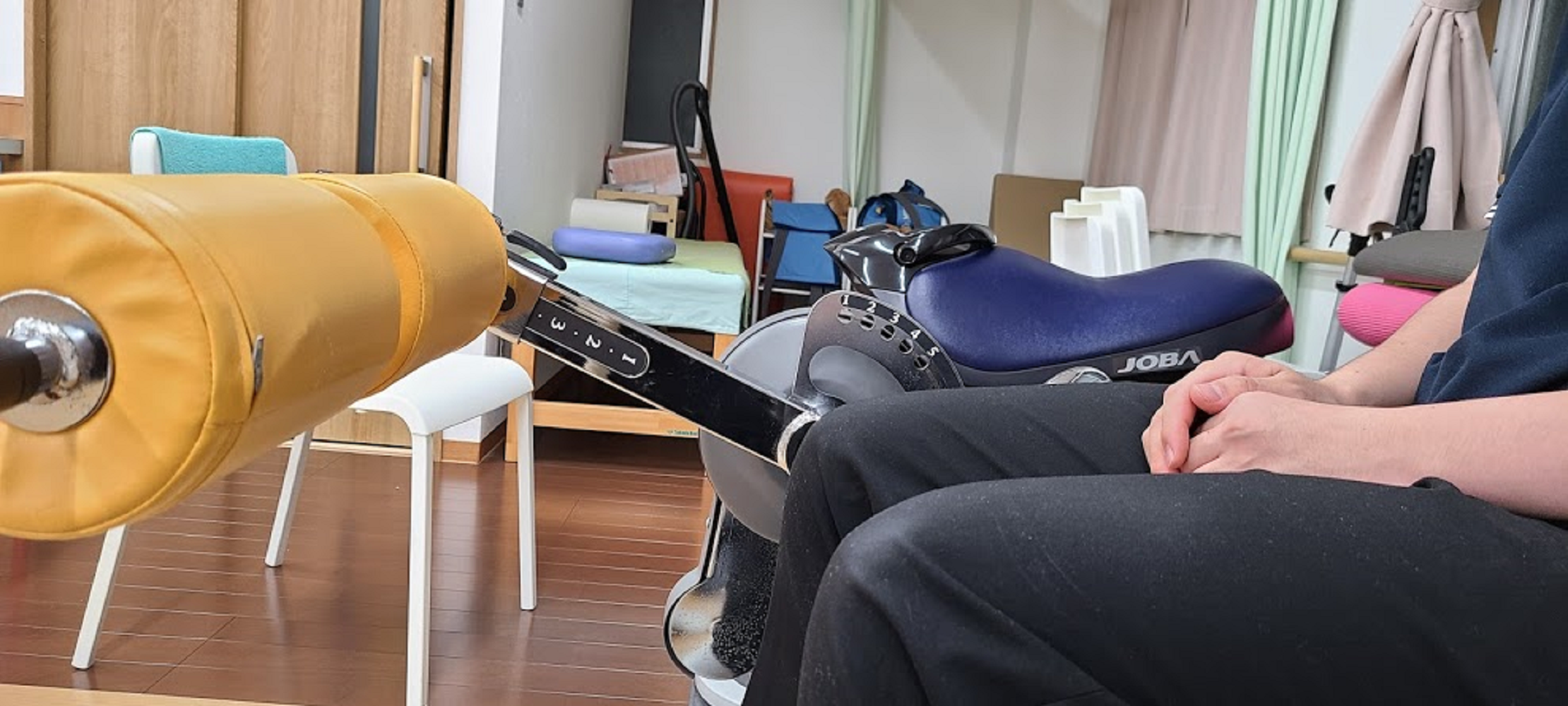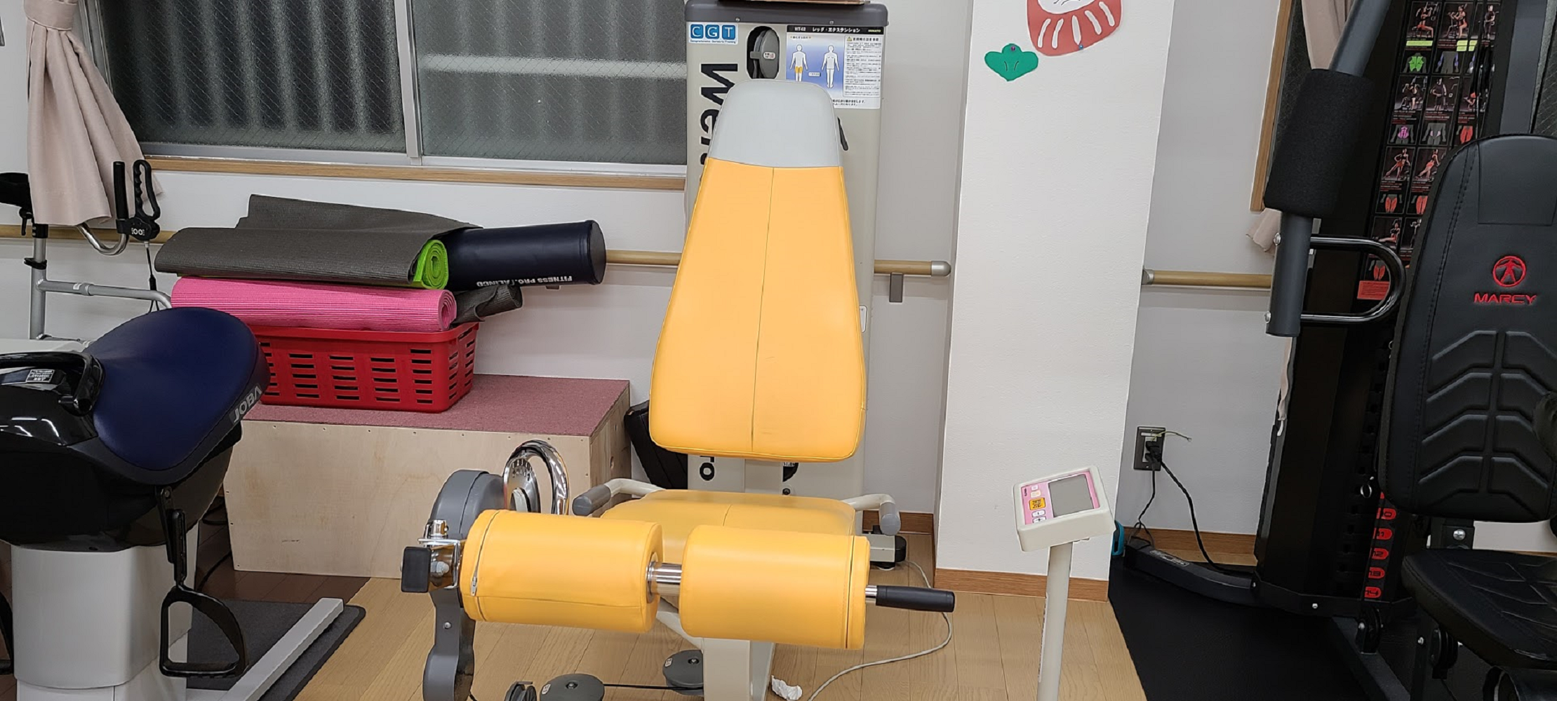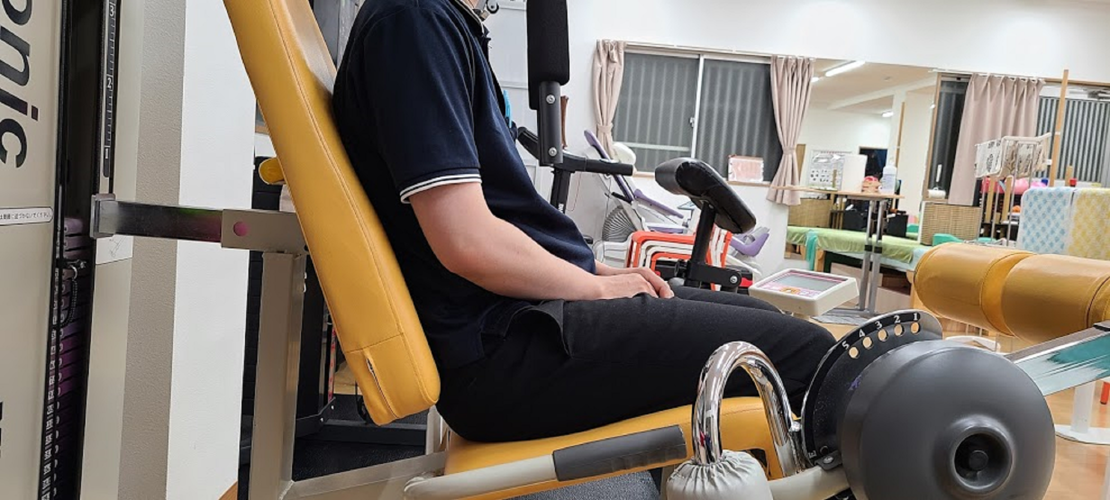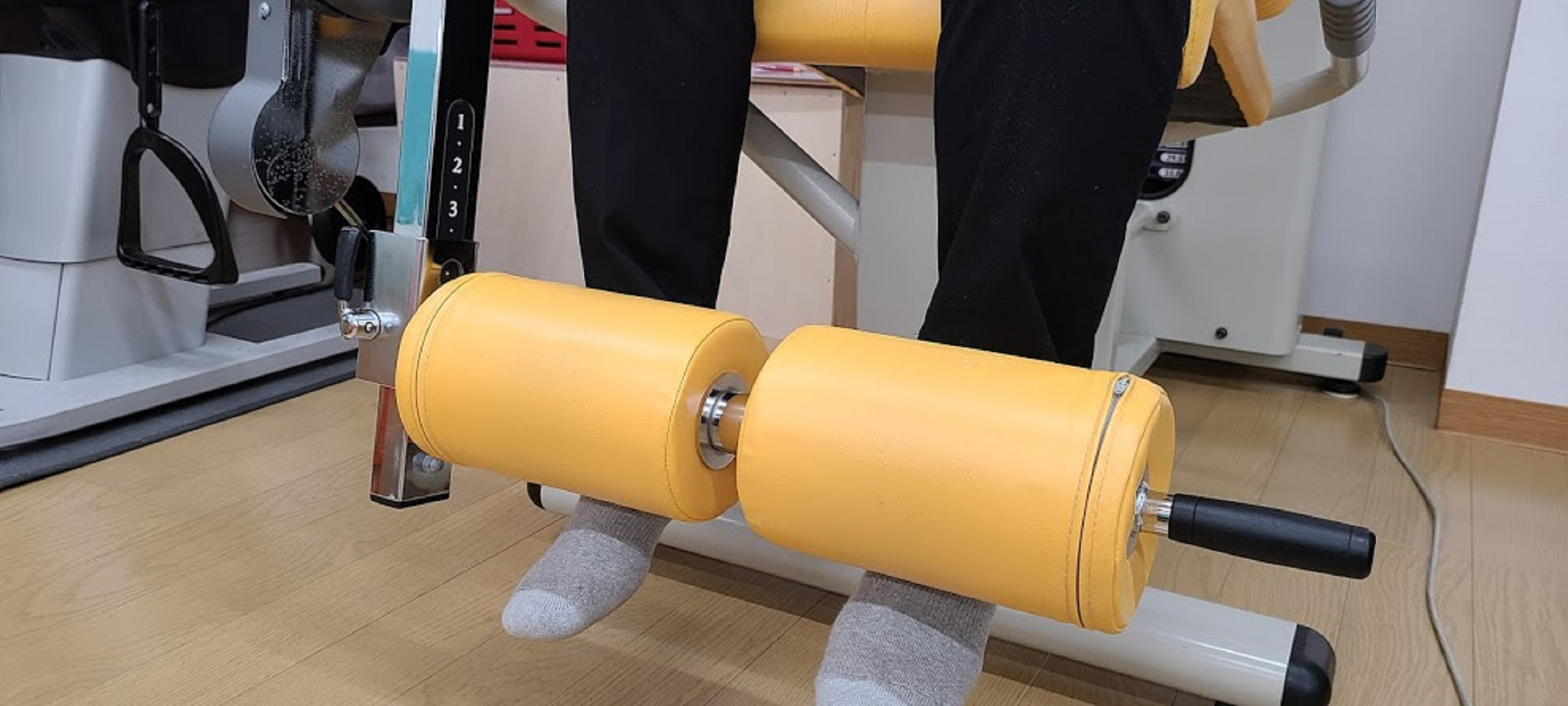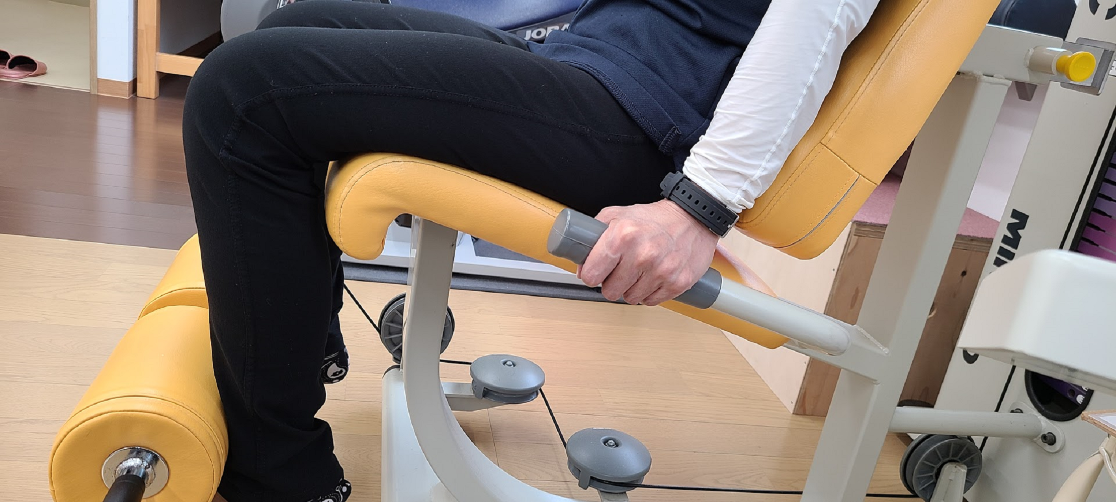 - 横の持ち手を持ってもらい、足を伸ばしていきます。足がまっすぐになるところまで伸ばしてもらいます。